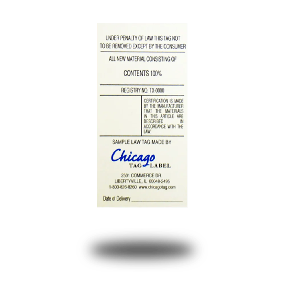Chicago Tag & Label proudly manufactures law tags compliant with TB117-2013, CPSC, SB1019, and AB2998 standards—ensuring your products meet all required safety and labeling regulations with precision and quality. Whatever the product, Tyvek® labels provide the durability and clarity you need.